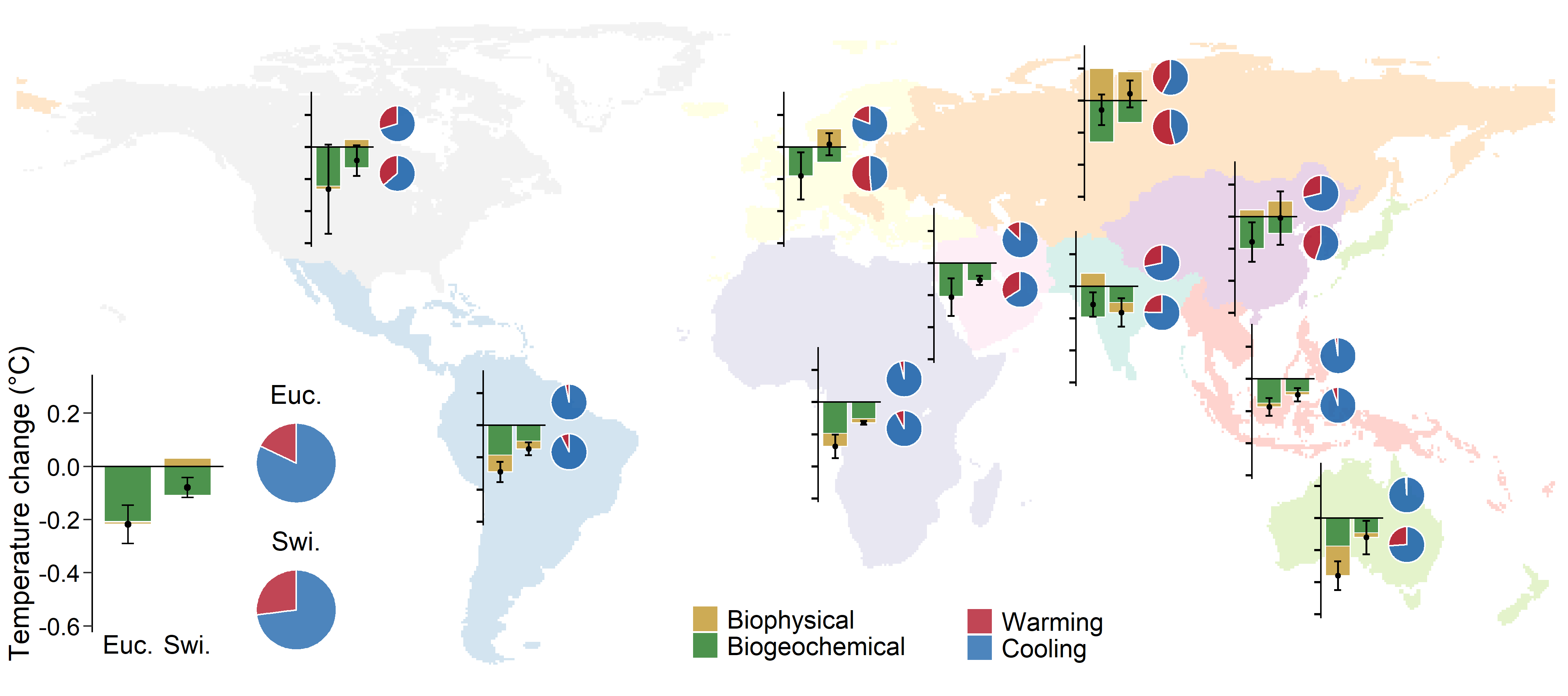 图1 桉树和柳枝稷种植在不同地区导致的生物地球化学和生物物理气温变化以及净升温和净降温的面积比例
