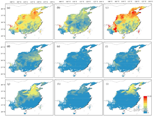 图2 GDM 模型模拟的麻栎的局部遗传偏移(a, b, c),正向遗传偏移 (d, e, f)和反向遗传偏移 (g, h, i)的分布。