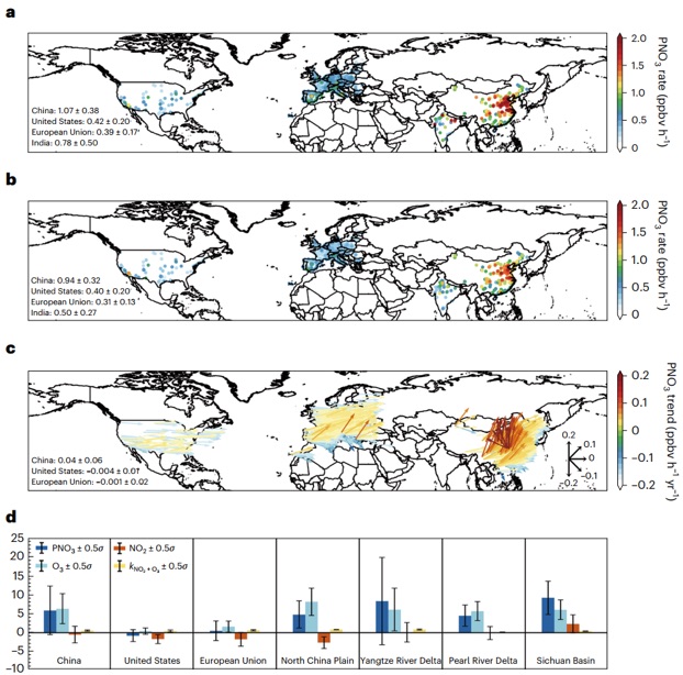 北京大学环境科学与工程学院陆克定研究员团队收集和分析了全球NOx和O3监测数据,系统评估了2014年至2021年全球近地面NO3的生成速率和趋势(如图1),揭示了我国和印度是全球夜间NO3自由基氧化反应的热点区域,且我国夜间NO3氧化性呈现持续增长,而欧美同期则呈现相对稳定或小幅下降趋势。