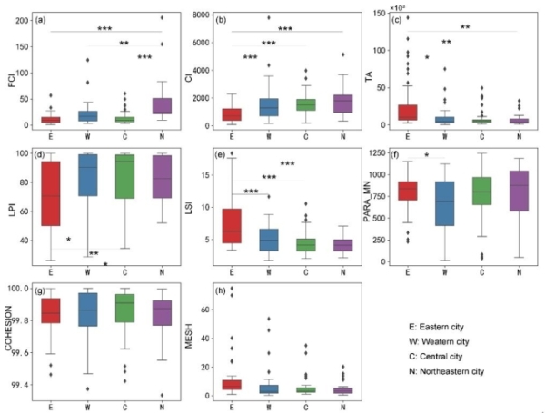 不同区域城市形态指标的分布特征。*、**、***表示结果分别在0.05、0.01、0.001水平上显著。