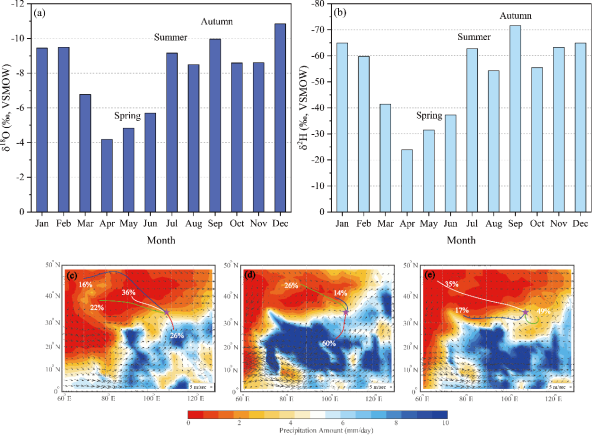 图3.年平均降雨氢和氧同位素比值变化和不同月份HYSPLIT降雨路径模拟