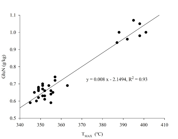 中国科学院东北地理与农业生态研究所研究人员依托保护性耕作长期定位实验(建于2001年)在国内首次开展了相关研究,包含免耕玉米-大豆轮作(NTCS)、秋翻玉米-大豆轮作(MPCS)、免耕玉米连作(NTCC)、秋翻玉米连作(MPCC)、常规耕作玉米连作且秸秆不还田(CTCC)5个处理。该研究采集了不同深度的土壤样品,测定其土壤热稳定性(图1),计算RE相关指标,同时与土壤异养呼吸及微生物残体进行相关分析。RE方法分为热解和氧化两个阶段,包括S1-S5五个阶段,具有多个相关指标,TMAX(℃)代表在S2热解阶段释放的富氢化合物达到峰值时对应的温度,可作为指示土壤有机碳成熟度的指标。HI表示在土壤有机碳中富氢化合物的相对含量,OIRE6表示在土壤有机碳在S3阶段释放的O2相对含量,代表土壤有机碳的相对氧化状态。T50代表在氧化阶段(S4)释放的CO2达到该部分总释放值50%时的温度,用来表征稳定性碳库。研究结果表明,耕作方式对RE指标影响很大(TMAX、HI、T50),但是作物轮作对其无显著影响,其中免耕显著提高了土壤表层的有机碳热稳定性(TMAX)。RE指标(HI)在短期室内培养实验中(<100天)可以很好地表征土壤异养呼吸情况,也在国际上首次发现TMAX指标与真菌残体(GluN)有很高的相关性(R2="0.93)(图2)。该研究为未来RE方法在国际上的推广应用提供了有效的数据支撑。