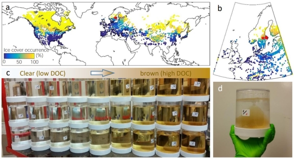 图1.2015-2020年北半球1-3月间湖泊冰盖出现频率(%)以及采样点位置放大图(红星表征湖泊野外样品采集点),不同DOC浓度梯度湖水样品湖冰生成实验装置及室内模拟实验。