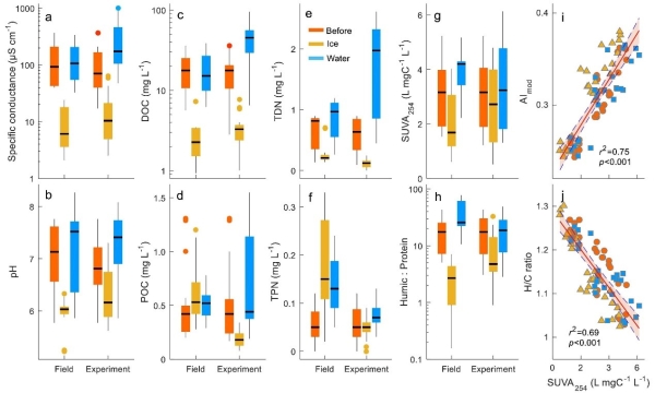 图2.野外现场采样和湖水冻结模拟实验中电导率、pH、溶解性有机碳(DOC)、颗粒态有机碳(POC)、溶解性总氮(TDN)、颗粒态总氮(TPN)、DOM比紫外吸收(SUVA254),以及腐殖质类与蛋白质类组分的荧光强度之和的比率(Humic : Protein)在未封冻前、冰封后水和冰中变化特征。SUVA254和相对丰度加权后的DOM芳香性指数、氢碳摩尔比之间的关系。