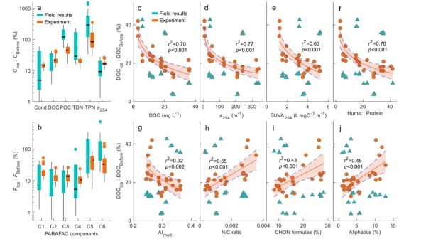 图3.野外现场采样和湖水冰冻模拟实验中理化参数及DOM相关参数的湖冰截留系数Cice : Cbefore变化特征及DOCice : DOCbefore与DOM光学和质谱相关参数之间的关系。