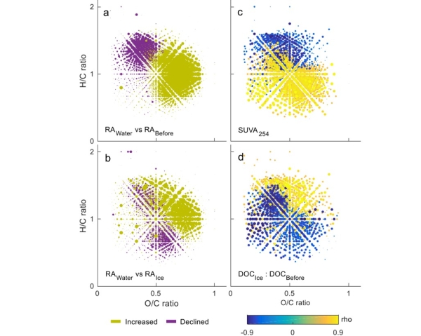 图4.高分辨率质谱Orbitrap研究结果。冰层覆盖下层未冻结水和未冰封前湖水DOM质谱峰平均相对丰度差异比较(a);下层未冻结水和上层冰盖DOM质谱峰平均相对丰度差异比较(b);DOM质谱峰相对丰度与SUVA254及截留系数DOCice : DOCbefore对应的van-Krevelen图谱Spearman秩相关分析结果。