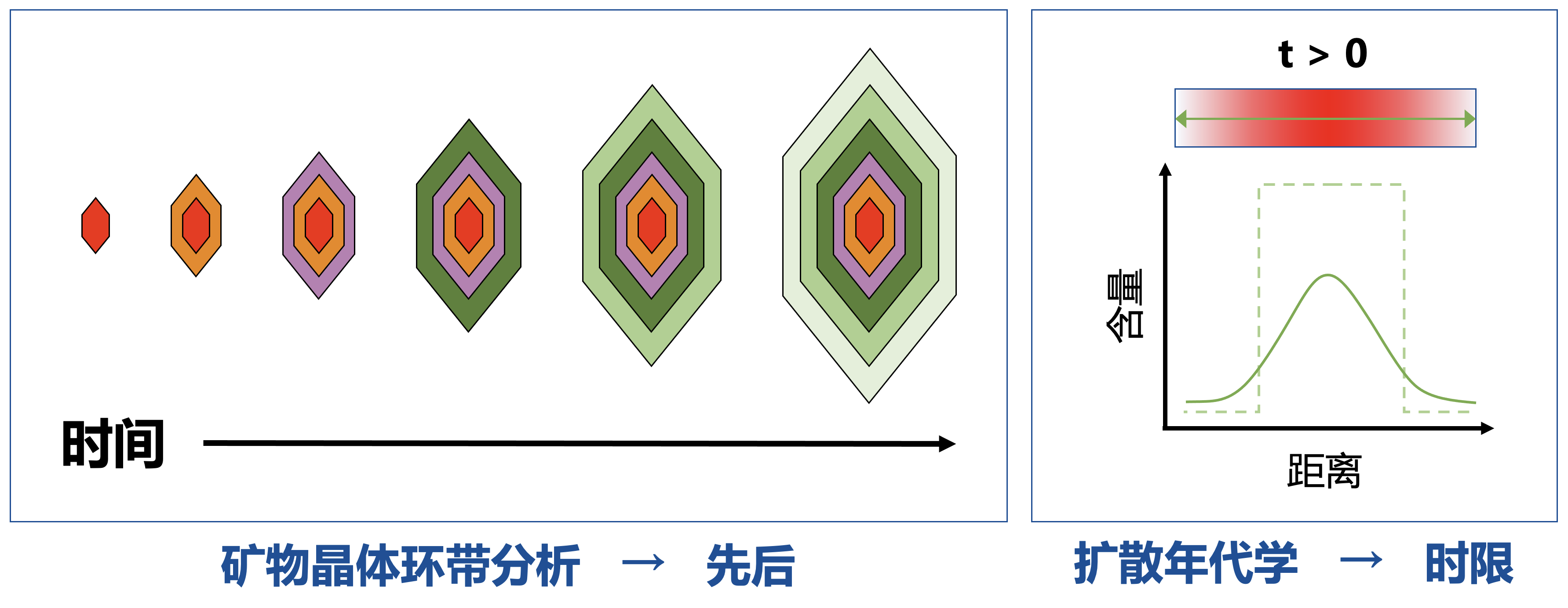 矿物是地球演化过程的亲历者与记录者,蕴藏着丰富的信息等待解译。基于微区分析技术,通过空间换取时间的思路,对矿物晶体由核到边开展氧等同位素分析,再通过扩散年代学约束时间,李扬与合作者建立起地质过程高时间分辨率解析技术体系(图1)。该技术具有广阔的应用前景,李扬与合作者在该领域开展了系列创新性研究,如通过石英和锡石等矿物约束成矿作用的时间和节律、探究高原隆升的机制等。这些研究得到国内外同行的广泛关注和认可,作为地质年代学和矿床地球化学领域活跃的青年学者,应《自然-地球科学》邀请,李扬以石英这一广泛存在的矿物为例,为“All minerals considered”专栏撰写论文,讲述石英参与并记录的地球演化历史、早期产氧过程和成矿作用等,及其作为人类祖先赖以生存的工具和现代科技领域重要原材料,服务于人类创新发展的故事。