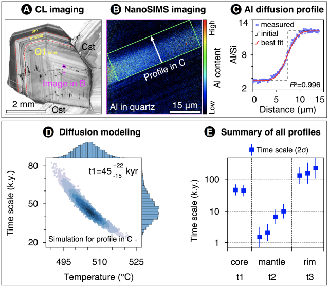 图2 通过微区分析技术实现成矿过程的高时间分辨率解析。(A)石英和锡石的阴极发光图像约束矿物生长历史与共生关系;(B)纳米离子探针石英Al含量分布成像;(C)石英Al扩散曲线拟合;(D)石英Al扩散年代学模拟计算;(E)热液体系不同阶段的时间尺度