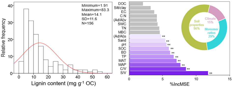 木质素作为一种主要的植物源性土壤有机碳组分,是反映滨海湿地不同植被组成和气候带下生物地球化学特征的独特生物标志物。然而,植物源木质素的纬度分布模式及其稳定性和控制机制仍不清楚。本研究我们沿着5000 km海岸带在39个样点共采集了156个土壤样品(0-40 cm),以探索生物和环境因素对木质素分布模式的影响。结果表明,木质素的含量范围为1.91至83.3 mg g−1 OC,在盐沼湿地中与SOC呈正相关,在红树林中与SOC呈弱负相关。SOC或木质素含量与C/V或S/V(肉桂基或丁香基与香草基的比值)呈正相关,而SOC或木质含量与(Ad/Al)V或(Ad/Al)S(香草基或丁香基的酸醛比)总体呈负相关,证实了生物标志物木质素单体降解参数的可靠性。研究发现,植物碳输入和木质素单体比值直接影响土壤中木质素的承载量。木质素含量和稳定性主要受土壤特性(即pH、EC、砂粒/黏粒)的控制。年均温(MAT)通过促进分解和改变植被与土壤生物地球化学(即微生物的底物可利用性)间接影响木质素的分布模式。