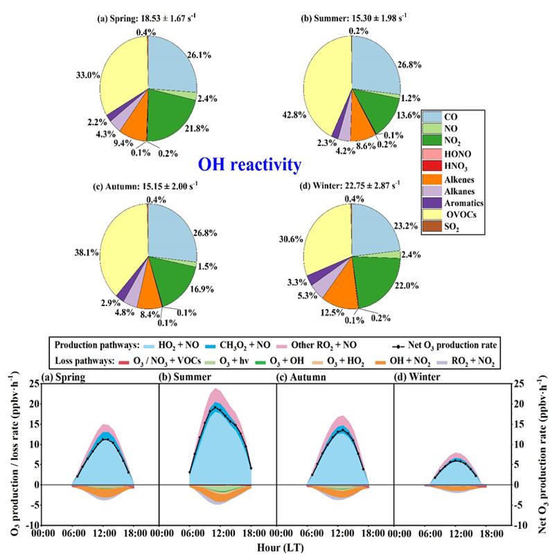本研究基于沿海城市宁德中心城区的大气外场观测,结合模式模拟分析宁德市区大气氧化能力、自由基化学和臭氧生成路径及敏感性的变化。结果表明,大气氧化能力和ROx自由基的水平呈明显的季节性变化,夏季最大,冬季最小。含氧挥发性有机物(OVOCs)(30.6%- 42.8%)、CO(23.2%-26.8%)、NO2(13.6%-22.0%)和烯烃(alkenes)(8.4%-12.5%)主导了OH自由基的损失。在冬季,亚硝酸(HONO)光解是OH自由基的主要来源,而在其他季节,OH自由基的来源从在上午以HONO光解为主转变成在午后以臭氧光解为主。敏感性分析表明,臭氧的生成在春、秋和冬季受VOCs控制为主,但在夏季,臭氧的生成主要受VOCs和NOx共同控制。其中,烯烃和芳香烃物种(如异戊二烯、顺/反-2-丁烯、乙烯、顺/反-戊烯、丙烯、甲苯、间-对二甲苯、三甲基苯)是臭氧生成的主控前体物。总之,该研究加深了对不同季节光化学污染和臭氧生成的理解,并阐明了快速城市化的沿海地区臭氧生成的控制方式,为减少沿海地区的臭氧污染提供了科学依据。
