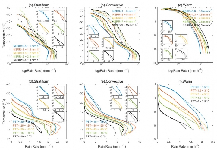 图1 在给定的近地表降水降水率(NSRR,第一行)和雨顶温度(PTT,第二行)条件下,洁净(虚线)和沙尘(实线)条件下的层性(a,d)、对流(b,e)和暖雨(c,f)降水垂直廓线的差异。不同的颜色表示不同的NSRR和PTT,子图重点关注混合层(-5~2°C)的降水。