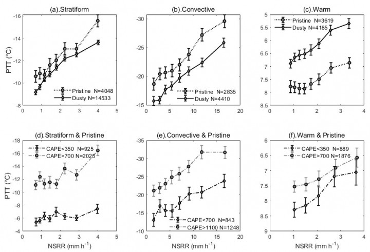 作为上述微观物理过程的宏观表现,我们发现,在一定的地表降水率下,沙尘降水的PTT比洁净降水的PTT要高(图2)。这是由特定的天气条件和潜在的气溶胶对沙尘天的间接影响共同决定的。通过量化分离这两种效应,发现CAPE每减少100 J/kg,对流降水和层性降水的初始PTT将分别增加0.65°C和0.41°C。这是沙尘天PTT偏暖的第一个原因。此外,大气中的沙尘气溶胶光学厚度每增加一个单位,对流降水和层性降水的PTT将分别增加4.19°C和0.35°C。这是沙尘天降水的PTT偏暖的第二个原因。