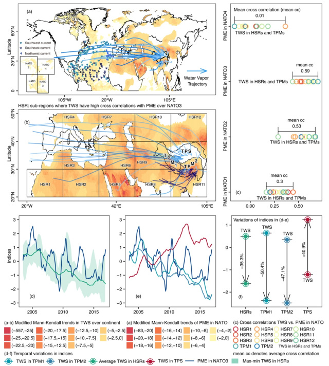 张强教授团队在深入剖析亚洲水塔水汽循环过程的基础上,全面量化了青藏高原的大气环流过程,系统解决了亚洲水塔研究中尚未解决的难点问题。研究团队全面论述并阐明了青藏高原陆地水储量演变的空间异质性及其背后的大气动力学机制(图1)。研究结果表明,青藏高原南部亚洲高山区的陆地水储量下降主要是受西风带传输的源自北大西洋东南部降水-蒸发(PME)亏缺的影响。此外,张强教授团队还通过动力学模拟证实了亚洲高山区阻止了PME亏缺进一步向青藏高原中部地区的传播,进而引发了青藏高原中部地区陆地水储量的增加。