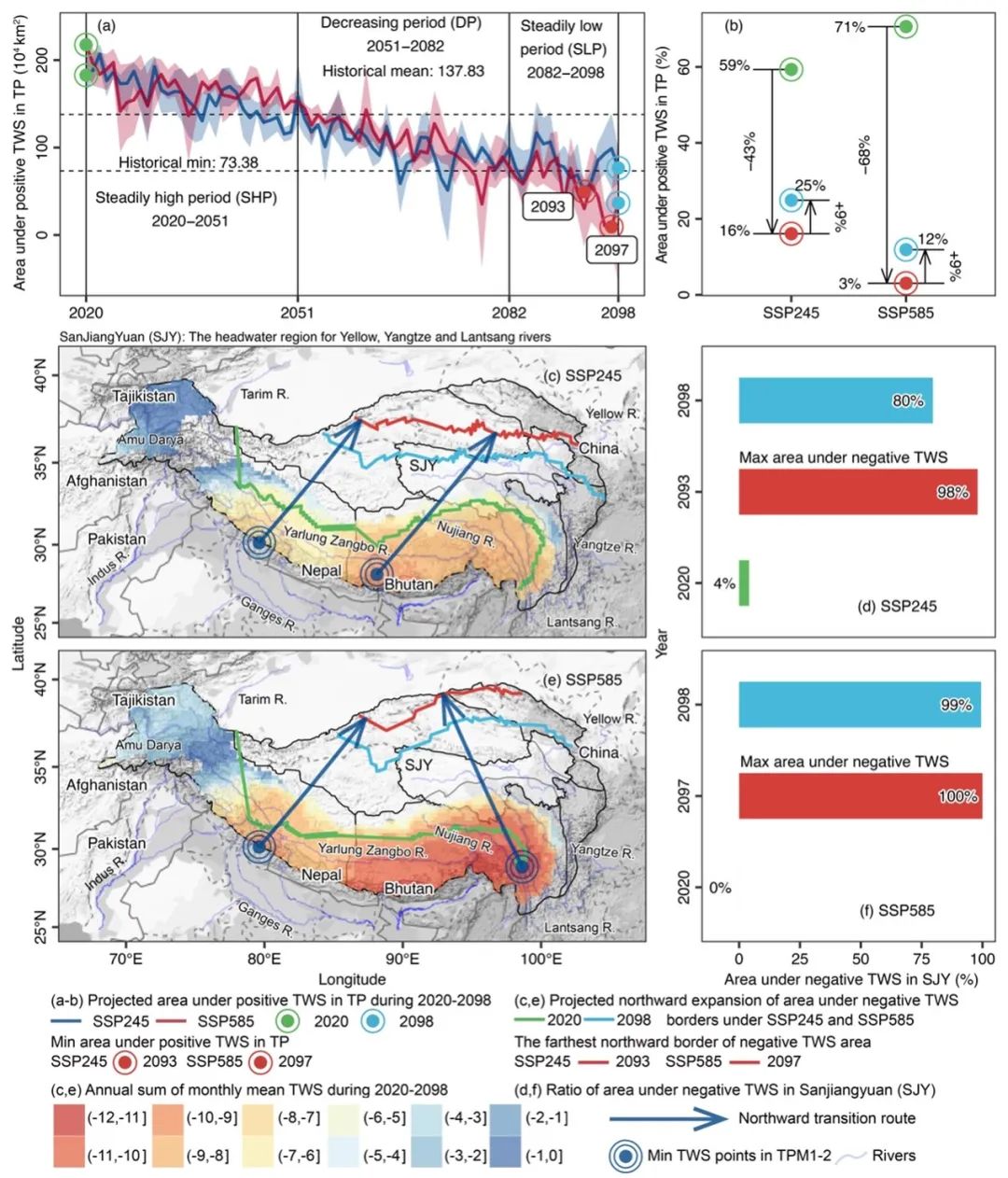 此外,张强教授团队进一步预测了青藏高原未来可能受陆地水储量亏缺影响的区域(图2)。在不同气候情景下的预测结果表明青藏高原预计有高达84%(SSP245)或97%(SSP585)的区域在本世纪末受陆地水储量亏缺的影响。这将严重威胁到亚洲主要河流水源供给的可持续性,进而可能会加剧下游地区的水资源危机。