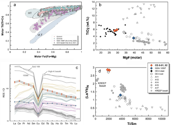图1.两个玄武岩岩屑(CE-5-01,02)中辉石的矿物化学成分分布(a)、全岩镁指数和钛含量(b)以及稀土元素含量投图(c和d)。HT:高钛玄武岩;LT:低钛;VLT:极低钛。