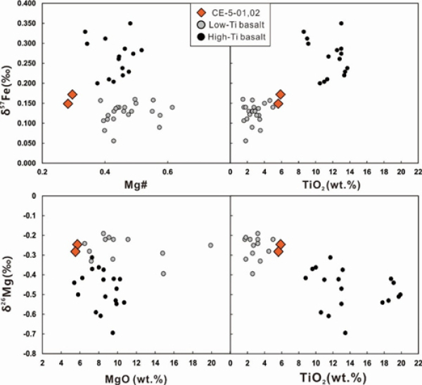 科研团队对两个玄武岩岩屑样品(编号CE5C0800YJYX038)开展了三维CT扫描,确认了岩屑样品是玄武岩岩屑,而不是撞击熔体。选取部分样品制成光片,开展详细的岩相学和矿物学原位分析,剩余样品溶解开展主微量元素和Fe-Mg-Sr同位素分析。结果表明,组成两个玄武岩岩屑的辉石、橄榄石和长石等的化学成分均与前人发表结果一致(图1),证实代表嫦娥五号着陆区本地的玄武岩岩屑。全岩主量元素和微量元素表明,嫦娥五号样品是迄今为止最演化的玄武岩(Mg#: 29,(La)N: 158),具有高铁(FeO: 24.7 wt.%)、高钍(Th: 5.1 μg/g)、居中钛含量(TiO2: 5.75 wt.%)的特点(图1),其全岩镁同位素(δ26Mg: -0.264 ± 0.015‰)和阿波罗低钛玄武岩一致,全岩铁同位素(δ57Fe: 0.161 ± 0.010‰)介于阿波罗低钛玄武岩和高钛玄武岩之间(图2)。