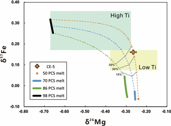 基于已获取的主微量元素及Fe-Mg同位素数据,研究团队估算了嫦娥五号玄武岩的母岩浆成分(图3),并对月球岩浆洋冷凝结晶过程进行了模拟计算。结果表明,岩浆洋早期结晶的富橄榄石堆晶具有轻Fe、重Mg的同位素特征,晚期富辉石堆晶具有重Fe、轻Mg的同位素特征。嫦娥五号月球样品的Fe-Mg同位素组成指示了其月幔源区可能为两种堆晶体的混合,晚期结晶的富单斜辉石堆晶比例可能为20-30%(图4)。富集单斜辉石堆晶可以显著降低月幔的熔点,可能对月球仍能产生年轻火山活动起到关键作用。
