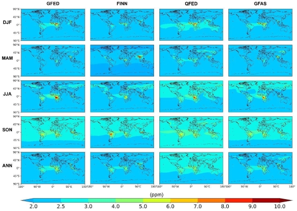 研究表明,全球火灾碳排放对大气二氧化碳浓度的年平均影响可达2.4百万分率(ppm),并存在较大的季节性变化。例如,非洲是全球生物质燃烧排放最高的地区,导致夏季二氧化碳浓度最高增加7.9-13.0百万分率(ppm)。模型评估结果显示,使用快速火灾排放数据库(QFED)作为模型先验火灾碳排放清单的模拟性能最佳,与卫星和地面观测结果差异最小。此外,研究还表明,在南美洲南部和欧亚大陆的大部分地区,模拟的二氧化碳浓度对火灾碳排放清单的敏感性较高,在非洲中部和东南亚敏感性较低。
