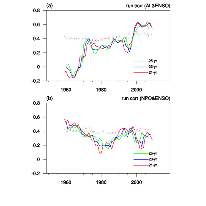 图1:(a) 早春阿留申低压强度指数和 (b) 冬季NPO指数与接下来冬季Nino-3.4海温指数在不同移动窗口下的滑动相关。虚线表示对应滑动相关系数通过95%信度检验 (计算相关系数显著性水平时,考虑了有效自由度)。