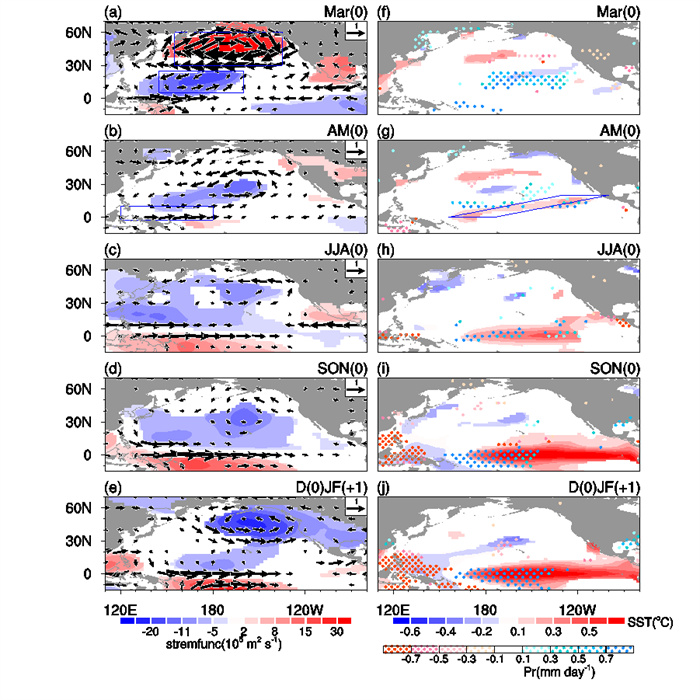 图2:早春阿留申低压强度指数回归的850-hPa流函数 (阴影) 和风场异常 (矢量) 的季节演变 (左列);右列为海温 (阴影) 和降水异常的季节演变 (点状) 。此图只展示超过95%置信水平的异常值。注意:早春阿留申低压强度指数回归的同期 (图2f) 和前期 (未展示) 热带中东太平洋海温极弱,说明早春阿留申低压对后期冬季ENSO的影响不是来自ENSO固有的准两年振荡周期。