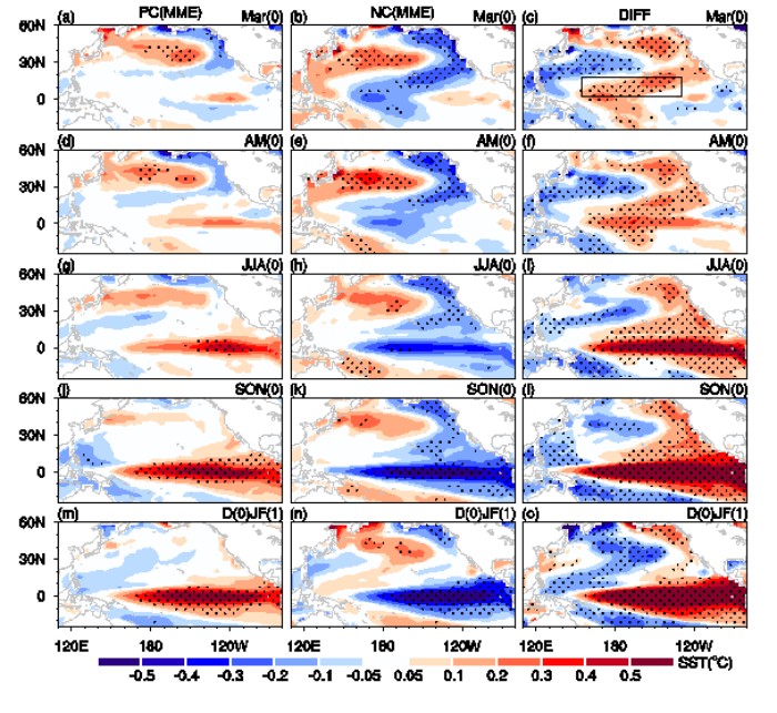 图3:CMIP6耦合模式中早春阿留申低压强度指数回归的海温异常演变。左列为正相关模式组集合平均;中列为负相关模式组集合平均;右列为正相关与负相关模式组集合平均的差异。点状区域表示海温异常通过95%置信水平。