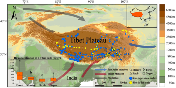 青藏高原位于我国西南部,平均海拔在4000米以上,被誉为世界“第三极”,拥有一个相对孤立而脆弱的高寒生态系统。青藏高原对环境与气候变化极其敏感,其气温升高速度约为全球平均速度的2-3倍。与极地地区不同,青藏高原位于中纬度地区,毗邻世界上污染较为严重的地区,如南亚、东亚和东南亚。先前冰芯与湖泊沉积物柱的研究发现,1860年以来汞在青藏高原土中呈现显著累积趋势。然而,由于青藏高原复杂的地形特征以及较困难的采样条件,青藏高原表层土壤汞的分布与来源有待深入研究。