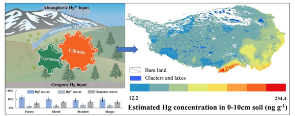 中国科学院地球化学研究所研究员冯新斌团队基于在青藏高原区域尺度的样本采集与汞稳定同位素的示踪技术,厘清了青藏高原地区土壤汞的积累分布及其影响因素,量化了土壤汞的来源组成,并初步揭示了气候变暖对高寒生态系统土壤汞的累积过程影响作用。相关结果可总结为如下两点: