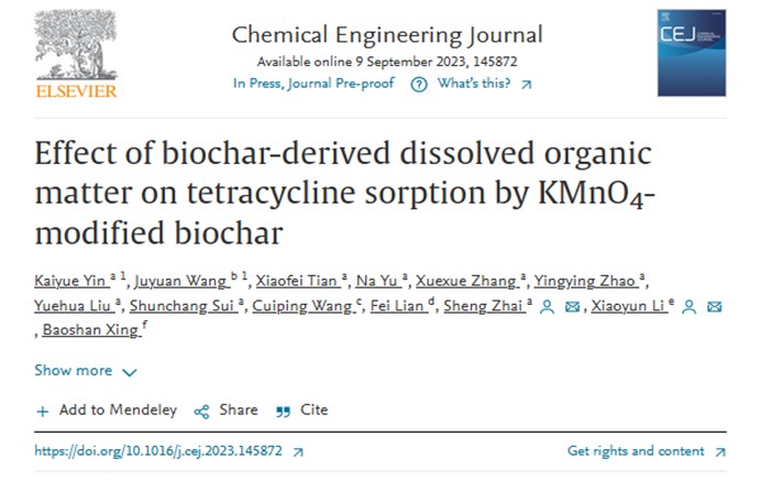 2023年9月9日,我校太阳成集团tyc33455翟胜教授团队在国际期刊《化学工程杂志》(《Chemical Engineering Journal》)上发表了题为《生物炭源溶解有机质对KMnO4改性生物炭吸附四环素的影响》(Effect of biochar-derived dissolved organic matter on tetracycline sorption by KMnO4-modified biochar)的研究性论文。这是翟胜教授团队继《Journal of Hazardous Materials》一区TOP期刊(IF="14.24)后又一创新性成果。